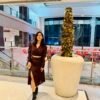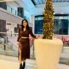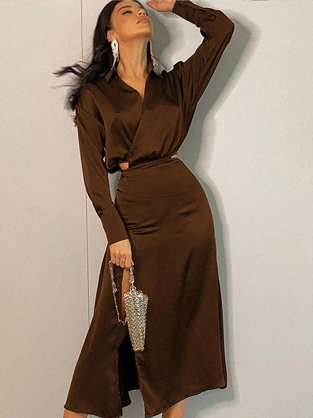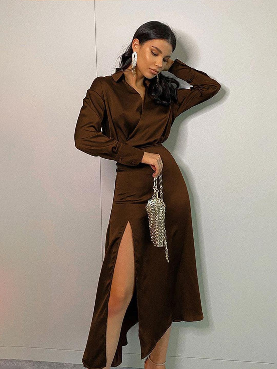 -55%This brown dress comes with a two piece effect with a thigh high slit it gives you a perfect look for any party u can down this dress with stilettos to complete the look.