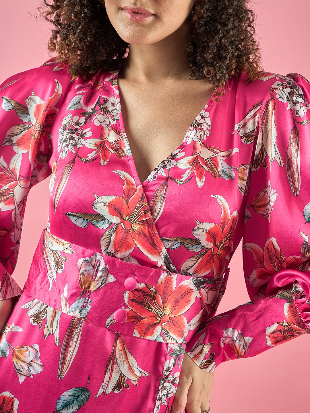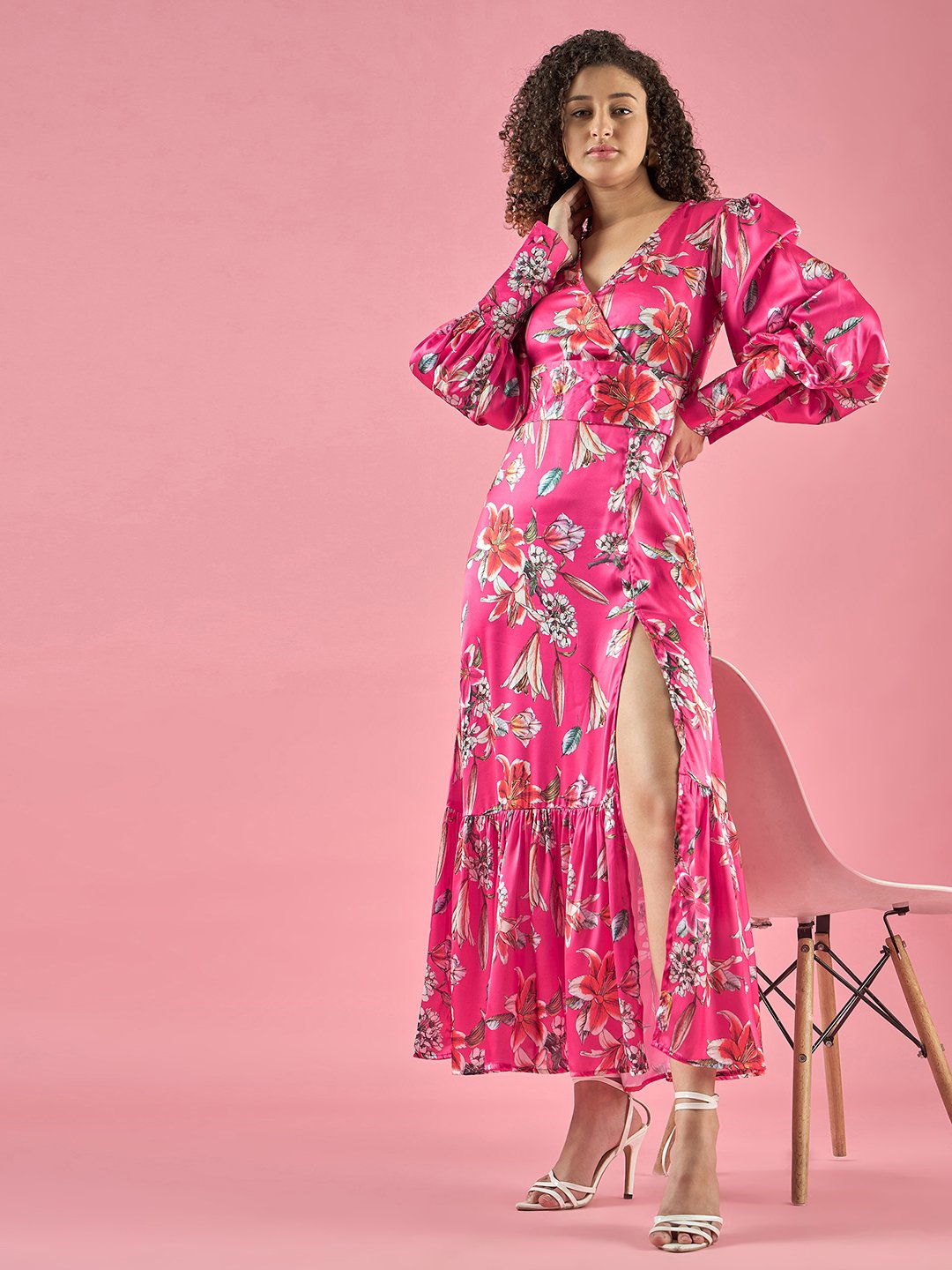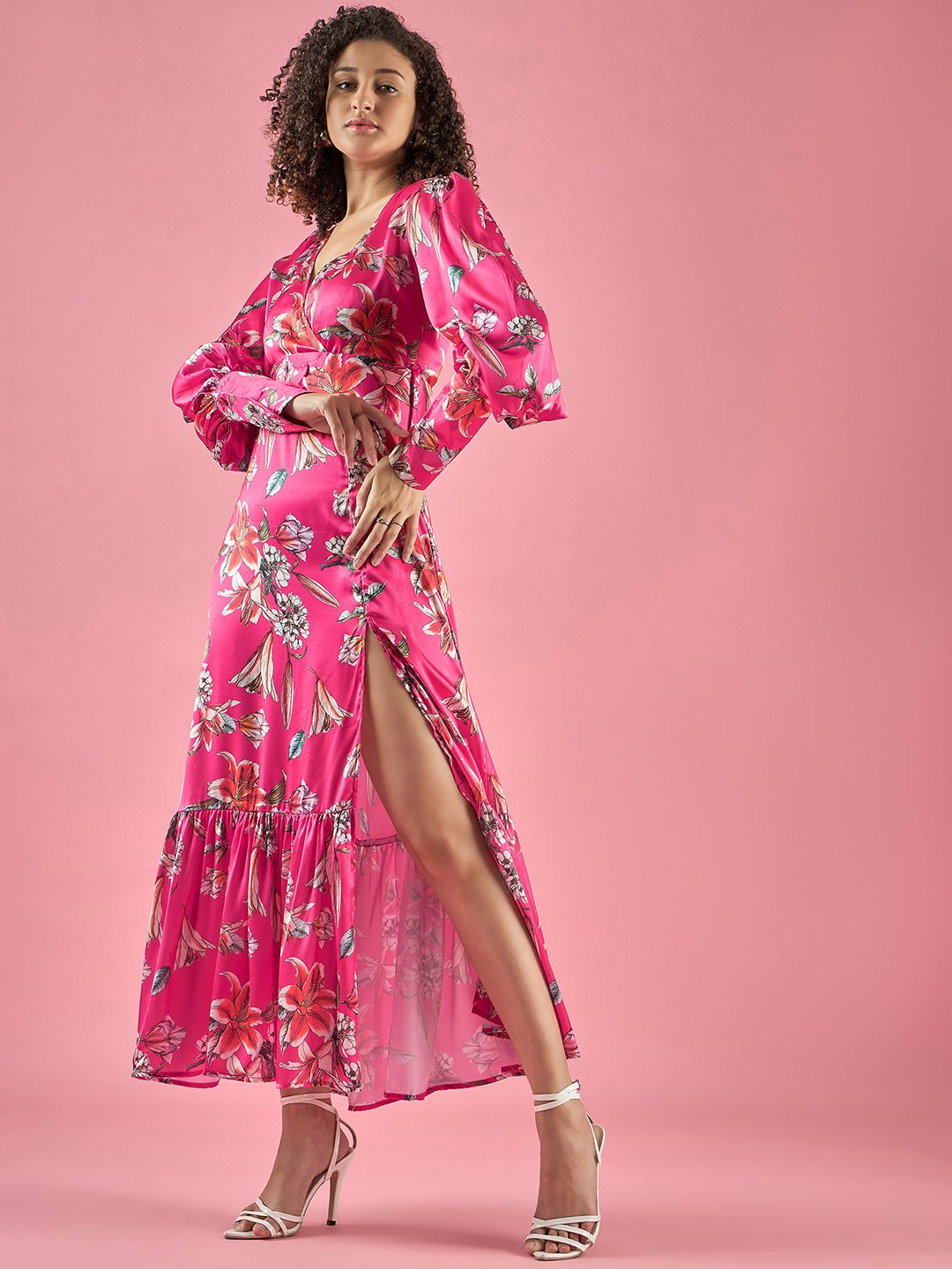 -40%Turn heads in this stunning pink satin dress featuring a v-neck, front slit, and gorgeous balloon sleeves.