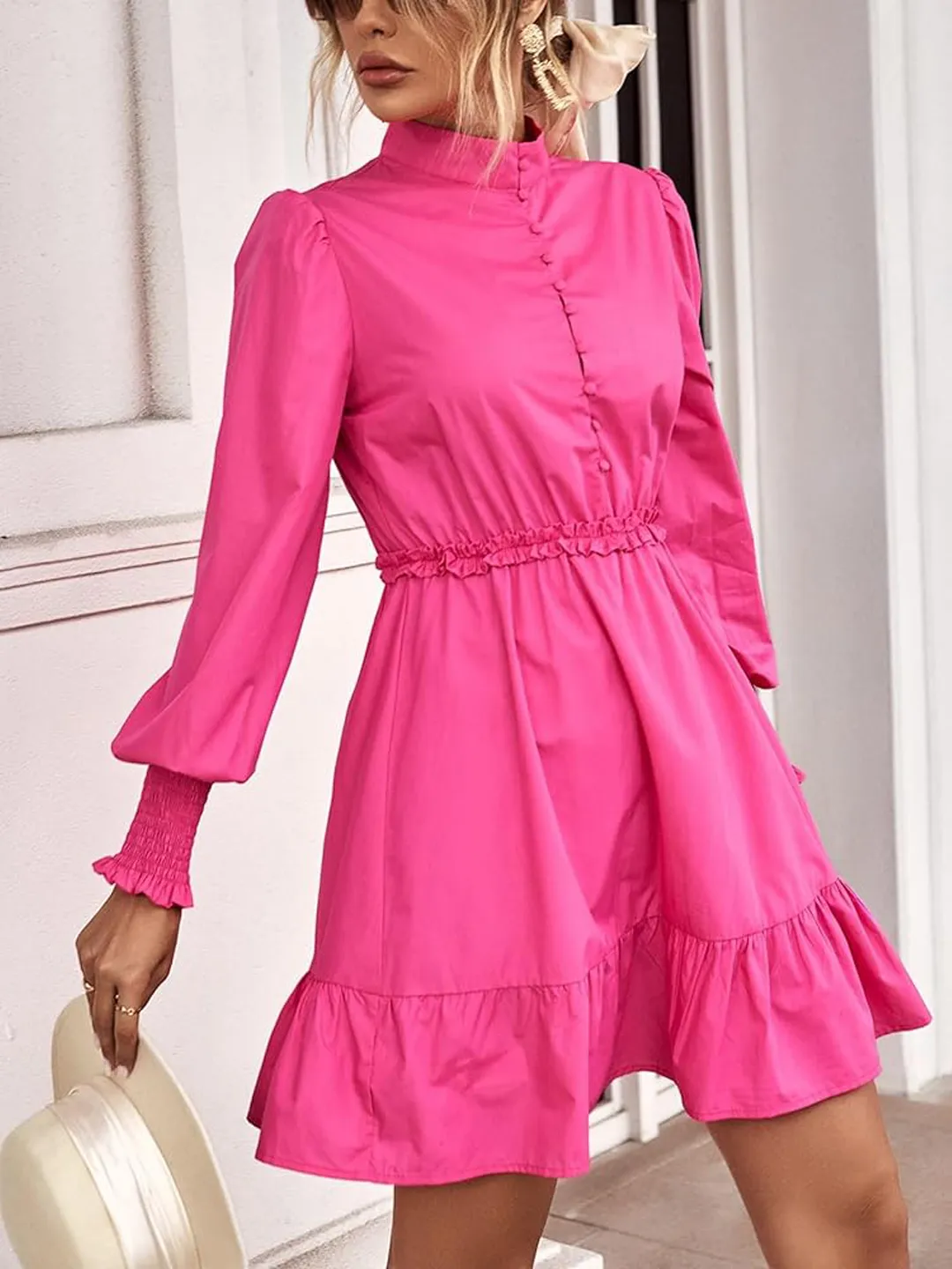 - Pattern: Mock neck dress with gathered details