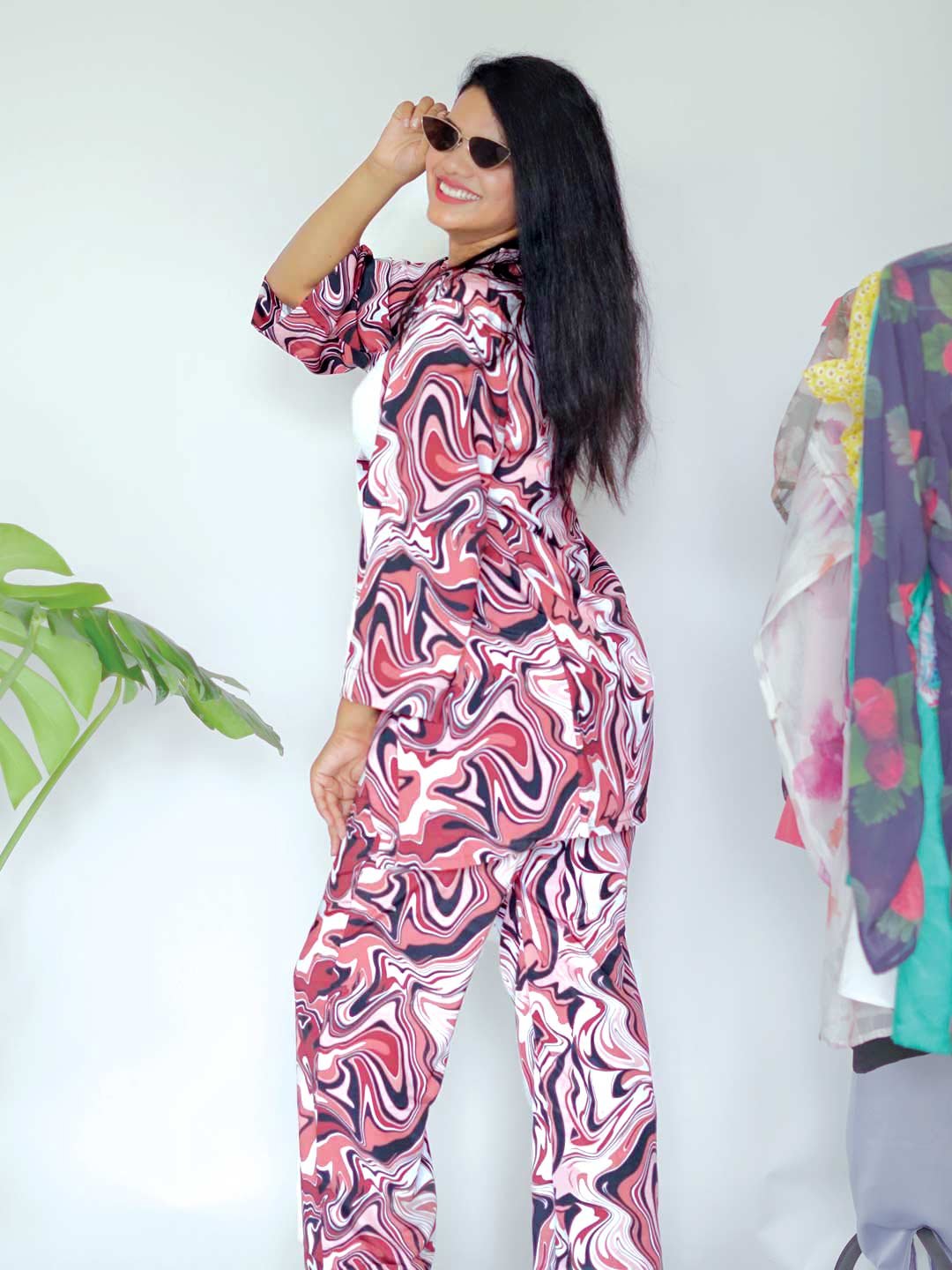 -44%Make sure you get relaxed feeling while carrying a super chic look.thid three pieces abstract print pant suit is especially crafted for a sunny day look .