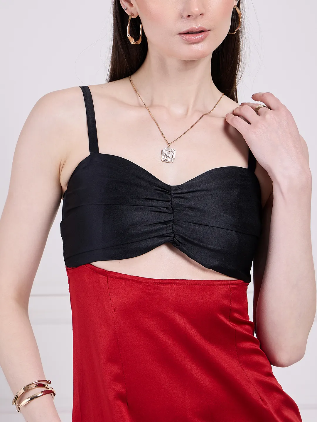 Rosy Red Square Neck Velvet Dress Red and Black Cut-out Satin Dress